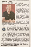 Fields, Leon Junior, 1946 - 2022 Leon Fields was born in 1946 to Leon A. Fields and Reba Lee Fields. He married Joanne R. Fields. They had one child, Tracy Doss. He lived in Roanoke, Virginia, and is buried in Old Dominion Memorial Gardens.