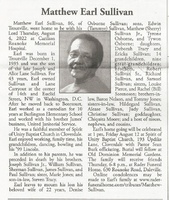 Sullivan, Matthew Earl, 1935 - 2022 Matthew Sullivan was born in 1935 in Troutville to Joseph and Alice Lane Sullivan. He married Denise Osborne Sullivan. He had six children: Edwin, Matthew Jr., Tyrone Osborne, Tywon Osborne, Deborah Tracey, and Ericka Sullivan. Matthew Sullivan died on August 4, 2022, and is buried in Old Dominion Memorial Gardens. He lived in Troutville.