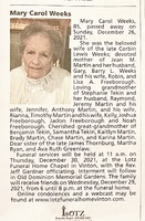 Weeks, Mary Carol, 1936 - 2021 Mary Weeks was born in 1936. She married Corbin Lewis Weeks. They had three children: Jean M. Martin, Barry L. Weeks, and Lisa A. Fireborough. Mary Weeks died on December 26, 2021, and is buried in Old Dominion Memorial Gardens.