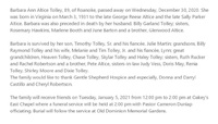 Tolley, Barbara Ann Altice, 1931 - 2020 Barbara Ann Altice Tolley was born on March 3, 1931 in Virginia to George Reese Altice and Sally Parker Altice. She married Billy Garland Tolley. They had one child, Timothy Sr. Barbara Tolley died on December 30, 2022, and is buried in Old Dominion Memorial Gardens. She lived in Roanoke.