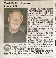 Hutcherson, Mark Richard, n.d. - 2022 Mark Hutcherson was born in 1948 to Thomas and Virginia Hutcherson. He married Melisa Hutcherson. They had one child, Mark R. Hutcherson Jr. Mark Hutcherson died on June 8, 2022, and is buried in Old Dominion Memorial Gardens. He lived in Roanoke.