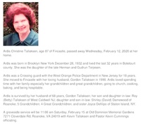 Tallaksen, Ardis Christine, 1932 - 2020 Ardis Christine Tallaksen was born on December 28, 1932 in Brooklyn, New York to Herman and Gudrun Terjesen. She married Gordon Tallaksen. They had two children, Roy and Shirley. Ardis Tallaksen died on February 12, 2020, and is buried in Old Dominion Memorial Gardens. She lived in Fincastle.