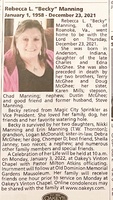 Manning, Rebecca L, 1958 - 2021 Rebecca "Becky" Manning was born 1958 in Anderson, Indiana to Charles and Edna McGhee. She married Steve Manning. She had three children: Nikki Manning, Erin Manning, and Chad Manning (stepson). Rebecca Manning died on December 23, 2021, and is buried in Old Dominion Memorial Gardens. She lived in Roanoke.