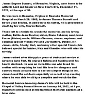 Burnett, James Eugene, 1962 - 2021 James Burnett was born in 1962 in Roanoke to James Thomas Burnett and Bettie Jean Blevins. He married Sharon Burnett. James Burnett died on December 31, 2021, and is buried in Old Dominion Memorial Gardens. He lived in Roanoke.