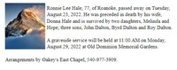 Hale, Ronnie Lee, 1945 - 2022 Ronnie Lee Hale was married to Donna Hale. They had five children: Melinda, Hope, John Dalton, Byrd, Dalton and Roy Dalton. Ronnie Hale died on August 23, 2022, and is buried in Old Dominion Memorial Gardens. He lived in Roanoke.