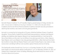 Crawford, Kenneth Wayne, 1946 - 2021 Kenneth Crawford was born in 1946 in Botetourt County to John Oliver Crawford and Pernie Florence Boothe Crawford. He married Winifred Kathleen Flowers Crawford. They had one child, Teresa Diane Crawford Garrett. Kenneth Crawford died on October 22, 2021, and is buried in Old Dominion Memorial Gardens. He lived in Troutville.