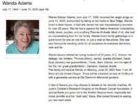 Adams, Wanda Switzer, 1943 - 2022 Wanda Adams was born in 1943. She married D.C. Adams. They had five children: Thomas, James, Juanita, David, and Ryan. Wanda died on June 13, 2022, and is buried in Old Dominion Memorial Gardens. She lived in Blue Ridge.