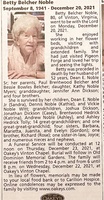 Noble, Betty Belcher, 1941 - 2021 Betty Noble was born in 1941 to Paul Brentwood Belcher and Bessie Bowles Belcher. She married Dean E. Noble. They had one child, Kathy Noble Myers. Betty Noble died on December 20, 2021, and is buried in Old Dominion Memorial Gardens. She lived in Vinton.