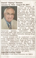 Henson, Daniel W, 1952 - 2021 Daniel "Danny" Henson was born in 1952 to Herbert Henson and Frances Cole Henson. He married Elizabeth "Beth" Testerman Henson. He had two stepchildren, Marty Robinette and Glenna Zimmerman. Daniel Henson died on August 29, 2021, and is buried in Old Dominion Memorial Gardens. He lived in Salem.
