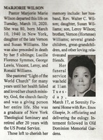 Wilson, Marjorie Maurie, 1940 - 2020 Pastor Marjorie Marie Wilson was born on March 10, 1940 in New York to Vernon and Susan Williams. She married Rev. Walter C. Wilson. They had two children, Leroy Wilson and Susan Williams. Marjorie Wilson died on March 10, 2020, and is buried in Old Dominion Memorial Gardens.