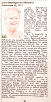 Whitlock, June Beninghove, 1952 - 2021 June Whitlock was born in 1952 to Joyce and John R. Beninghove Sr. She married Raymond Nelson Whitlock. They had one child, Lindy Nicole Whitlock Bickish. June Whitlock died on December 19, 2021, and is buried in Old Dominion Memorial Gardens.