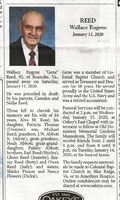 Reed, Wallace Eugene, 1938 - 2020 Wallace Eugene "Gene" Reed was born in 1938 to Camden and Nellie Reed. He married Alva M. Reed. They had two children, Patricia Thomas and Michael Reed. Wallace Reed died on January 11, 2020, and is buried in Old Dominion Memorial Gardens. He lived in Roanoke.