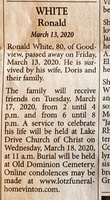 White, Ronald, 1940 - 2020 Ronald White was born in 1940. He married Doris. He had two sons, Terry White and Michael White. Ronald White died on March 13, 2020, and is buried in Old Dominion Memorial Gardens. He lived in Goodview.