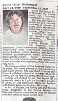 McGonigal, Lorita, 1940 - 2021 Lorita "Rita" McGonigal was born in 1940 in Salem to Zenah Fogus. She married John McGonigal. They had two children, Melody Underwood and Katrina Mahala. Lorita McGonigal died on September 25, 2021, and is buried in Old Dominion Memorial Gardens. She lived in Roanoke.