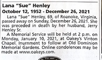 Henley, Lana, 1952 - 2021 Lana Henley was born in 1952. She married Jerry Henley Sr. Lana Henley died on 2021, and is buried in Old Dominion Memorial Gardens.