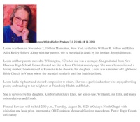 Pinckney, Leona Mildred, 1946 - 2020 Leona Mildred Sellers Pinckney was born on November 2, 1946 in Manhattan, New York to William R. Sellers and Edna Alice Kelly Sellers. She had one child, Kimberly Pinckney Eller. Leona Pinckney died on August 16, 2020, and is buried in Old Dominion Memorial Gardens.