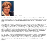 McNeil, Laura Mae, 1939 - 2021 Laura McNeil was born in 1939. She married Howard Grayson McNeill. They had three children: Reverand David McNeill, Robin McNeill Dunavant, and Danny McNeill. Laura McNeill died on September 30, 2021, and is buried in Old Dominion Memorial Gardens.