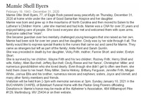 Bliss, Marilyn Mae, 1946 - 2021 Marilyn Mae "Bo" Bliss was born on March 15, 1946 in Alleghany County to Harry Nelson and Hallie Virginia Unroe Bliss. She had two sisters, Evelyn and Carolyn. Marilyn Bliss died on June 7, 2021, and is buried in Bethel United Methodist Cemetery. She lived in Iron Gate.