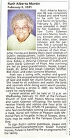 Martin, Ruth Alberta, 1932 - 2021 Ruth Alberta Martin was born August 23, 1932 to Oliver Gilbert Allen and Gay B. Morgan Allen. She married William Curtis Coleman in 1951. After his death in 1960, she married John Dennis Martin in 1971. Her children include Curtis Coleman and Bobby Coleman, and stepdaughters Judith Salmon, Barbara Martin, and Doris Quinn. Ruth Martin died February 6, 2021, and is buried in Pleasant Dale Memorial Park in Fincastle.