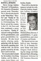 Jenkins, Davis George, 1932 - 2020 Davis George Jenkins "Brownie", also known as "Meat Man," "Boobie," and "Daddy B", was born on May 11, 1932 in Christiansburg to Cora King Jenkins and his father. He married Charlotte Jenkins. They had three children: LaTony Thompson, Lynn Andrews, Alphonso Gilbert, Jr. Davis Jenkins died on February 6, 2020, and is buried in Old Memorial Gardens. He lived in Greensboro, North Carolina, but previously in Roanoke.