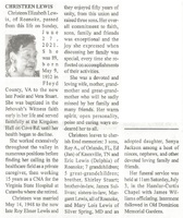 Lewis, Christeen Elizabeth, 1932 - 2021 Christeen Elizabeth Lewis was born on May 9, 1932 in Floyd County to Posie and Vera Stuart. She married Roy Elmer Lewis in May 14, 1948. They had three children: Roy, Ed, and Eric. Christeen Lewis died on June 27, 2021, and is buried in Old Dominion Memorial Gardens. She lived in Roanoke.