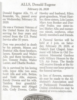 Alls, Donald Eugene, n.d. - 2020 Donald Eugene Alls, of Roanoke, was born to Mason and Beatrice Alls. He married Joyce Alls. They had two children, Scott and Todd, and a stepchild, Randy Downs. Donald Alls died on February 26, 2020, and is buried in Old Dominion Memorial Gardens.