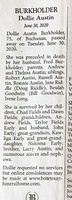 Burkholder, Dollie Austin, n.d. - 2020 Dollie Austin Burkholder, of Buchanan, was born to Andrew and Thelma Austin. She married Fred Burkholder. They had two children, Chad and Dawn Fields. Dollie Burkholder died on June 30, 2020.