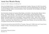 Beatty, Annie Inez Meador, 1928 - 2020 Annie Inez Meador Beatty was born on October 27, 1928 to Joe and Vonnie Meador. She married Blain Beatty. They had six children: Vicky Saunders, Gloria Moyer, John Beatty, Tina Wade, Roger Beatty, and Gail Detamore. Annie Beatty died on February 25, 2020, and is buried at Old Dominion Memorial Gardens. She lived in Moneta.
