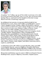 Collins, Josephine, 1928 - 2021 Josephine "Jo" Collins, of Cloverdale was born in Hot Springs in 1928 to George Mason and Elsie Armstrong Carpenter. She married James "Ed" Collins, and had 3 children: Michael Collins, Frank Collins, Brenda Fowler, and 2 step-sons Jimmy Carter and Robert "Butch" Carter. Josephine Collins died June 10, 2021 and is buried at Mill Creek Cemetery.