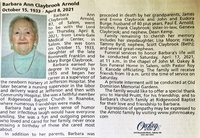 Arnold, Barbara Ann Claybrook, 1933 - 2021 Barbara Ann Claybrook Arnold was born on October 15, 1933 to Roosevelt Franklin and Mary Burge Claybrook. She married Paul E. Arnold. She has one stepdaughter, Lisa Moore. Barbara Arnold died on April 8, 2021, and is buried in Old Dominion Memorial Gardens. She lived in Salem.