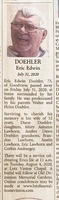 Doehler, Eric Edwin, 1946 - 2020 Eric Edwin Doehler was born in 1946 to Walter and Helen Doehler. He married Diane Doehler. They had two children, Misty Autumn Lawhorn and Amber Dawn Doehler. Eric Doehler died on July 31, 2020, and is buried in Old Dominion Memorial Gardens. He lived in Goodview.
