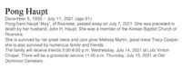 Haupt, Pong Nam, 1939 - 2021 Pong Nam Haupt "May" was born on December 5, 1939. She married John H. Haupt. Pong Haupt died on July 11, 2021. She lived in Roanoke and was buried at Old Dominion Memorial Garden.