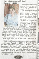 Buck, Patricia Louise Aliff, 1942-2021 Patricia Louise Aliff Buck, of Salem, was born on August 23, 1942 to June Aliff and Clarence Aliff. She married James Harwood Buck on August 22, 1958. They had two children, Jamie Buck and Gary Buck. Patricia Buck died on August 11, 2021, and is buried in Mill Creek Cemetery.