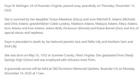 Ballinger, Gaye N, 1952 - 2020 Gaye N. Ballinger was born on May 16, 1952 in Summer County, West Virginia to Jack and Nillie Lilly. She had three children: Tonya Meadows, Mitchell R. Adams, and Chris Adams. Gaye Ballinger died on December 10, 2020, and is buried in Old Dominion Memorial Gardens. She lived in Roanoke.