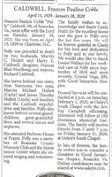 Caldwell, Frances Pauline Coble, 1929 - 2020 Frances Pauline Coble "Polly" Caldwell was born on April 15, 1929 in Charlotte, North Carolina. She was married to Marvin C. Hullett and Harry E. Caldwell. She has three children: Frances Blair Nordberg, Marvin Michael Hullett, and James Timothy Hullett, and one stepchild, Richard Caldwell. Frances Caldwell died on January 28, 2020, and is buried in Old Dominion Memorial Gardens. She lived in Roanoke.