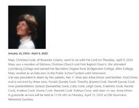 Cook, Mary Christina, 1933 - 2020 Mary Christina Cook was born on January 10, 1933 in Roanoke County to Rev. F. Wise and Edna driver. She had three children: Ronald Cook, Timothy Cook, and Darrell Cook. Mary Cook died on April 9, 2020, and is buried in Old Dominion Memorial Gardens. She lived in Roanoke.