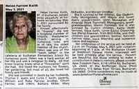 Keith, Helen Elizabeth Farrow Ayers, 1933 - 2021 Helen Elizabeth Farrow Ayers Keith was born on August 27, 1933 to William Dixon Farrow and Elizabeth Price Weaver Farrow (obituary lists Ruby Farrow as her mother, but Marriage Return lists Elizabeth Weaver). She married Thomas Eugene Ayers, who died in 1960, and later Curtis Floyd Keith. Her children include Gay Gladson, Dolly Montgomery, Wayne Ayers, and Susan Ayers. She died May 1, 2021, and is buried in Noftsinger-Styne-Pico Cemetery.