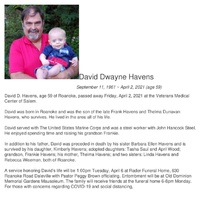 Havens, David Dwayne, 1961 - 2021 David Dwayne Havens was born on September 11, 1961 in Roanoke to Frank Havens and Thelma Dunavan Havens. He has three daughters, Kimberly Havens, Tasha Saul, and April Wood. David Havens died on April 2, 2021, and is buried in Old Dominion Memorial Gardens. He lived in Roanoke.