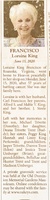 Francisco, Ellen Loraine King, 1939 - 2020 Loraine King Francisco, of Roanoke, was born to Alfred S. and Mable V. King. She married Carl Francisco. They had two children, Michael Trivette and Deana Trivette Trent. Loraine Francisco died on June 15, 2020, and is buried in Old Dominion Memorial Gardens. She lived in Roanoke.
