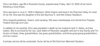 Aders, Oma Lee, 1930 - 2020 Oma Lee Aders was born in Matewan, West Virginia on June 3, 1930 to Seymour E. and Nell Dotson Blackburn. She married Jack C. Aders. They had two children, Jack C. Aders and Sandy Guzior. Oma Aders died on April 10, 2020, and is buried in Old Dominion Memorial Gardens. She lived in Roanoke County.