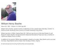 Boothe, William H, 1952 - 2020 William Henry Boothe was born in Willis on March 20, 1952 to Chester A. and Bessie M Hylton Boothe. He died on October 10, 2020.