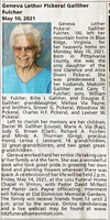 Fulcher, Geneva Pickeral Galliher, 1921 - 2021 Geneva Lether Pickeral Galliher Fulcher was born in 1921 in Pittsylvania County to Clarence and Alice Divers Pickeral. She was married to Malcolm Galliher and Cairy T. Fulcher. She had three children: William M. Fulcher, Billie L. Galliher, and Douglas E. Galliher. Geneva Fulcher died on May 10, 2021, and is buried in Old Dominion Memorial Gardens. She lived in Blue Ridge.