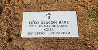 Bare, Fred Deacon, 1930-2020 Fred Deacon Bare was born September 2, 1930, to Lester A & Grace Deacon Bare. He married Jean Vanness Bare in 1954. His children includ Karen Harth, Sandra Bare-Chapman, and Dale Bare. He died July 29, 2020, and is buried at Mill Creek Cemetery.