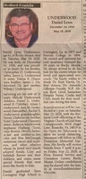Underwood, Daniel Lynn, 1958 - 2020 Daniel Lynn Underwood was born on December 12, 1958 to James L. Underwood and Wilma J. Underwood. He married Melody Underwood. They had four children: Daniel II, Seth, Adam, and Rachel. Daniel Underwood died on May 19, 2020, and is buried in Old Dominion Memorial Gardens. He lived in Rocky Mount.