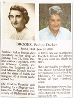 Brooks, Pauline Decker, 1930-2020 Pauline Decker Brooks was born June 6, 1930 in Botetourt County to Carl Decker and Mamie Goad Decker. She married Joseph E. Brooks. She had two daughters, Denise Eareckson and Donna Brooks. She died June 21, 2020.
