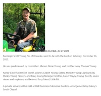Young, Randolph Scott, 1962 - 2020 Randolph Scott Young, of Roanoke, was born on October 16, 1962 to Marion Eloise Young and Charles Gilbert Young. He died on December 27, 2020, and is buried in Old Dominion Memorial Gardens.