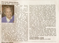 Bryan, Ella Faith, 1937 - 2021 Ella Faith (White) Bryan was born on July 20, 1937 in MacDonald, Mississippi to Adam and Mary Ruth (Cliburn) White. She married Rev. James H. Bryan on April 5, 1958. They had three children, Jim, David, and Jonathan. Ella Bryan died on July 17, 2021, and is buried at Pleasant Dale Memorial Park. She lived in Fincastle.