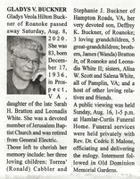 Buckner, Gladys Veola Hilton, 1936 - 2020 Gladys Veola Hilton Buckner was born on December 17, 1936 in Prospect, Virginia to Sarah H. Bratton and Leonadis White. She had three children, Torrea Cabbler, Stephanie J. Buckner, and Deffrey K. Buckner. Gladys Buckner died on August 8, 2020, and is buried in Old Dominion Memorial Gardens. She lived in Roanoke.