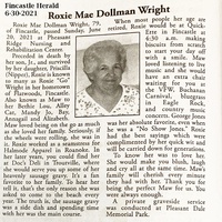 Wright, Roxie Mae Dollman, 1941 - 2021 Roxie Mae Dollman Wright was born in 1941. She married and divorced Joseph Arthur Wright. Her children included Joseph Arthur Wright, Jr. and Priscilla Wright. She died June 20, 2021, and is buried at Pleasant Dale Memorial Park.