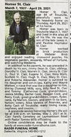 St. Clair, Homer Neal, 1937 - 2021 Homer Neal St. Clair was born to James Hubert Bowyer St. Clair Sr and Pauline Marie Haymaker St. Clair. He married (and divorced) Nancy Louise Asbury McCullough. He had a son, Jimmy Dean St. Clair, and a daughter, Kathy Walters. He died April 29, 2021, and is buried in Saint Clair Cemetery. He lived in Troutville.